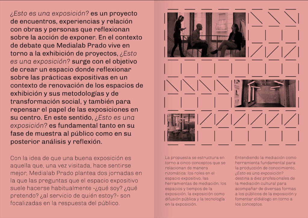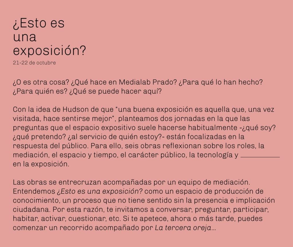 ¿Esto es una exposición? es un proyecto de comisariado de una exposición que realicé para Medialab Prado, junto a Belén Soto y Paloma Gonzáles durante mi estadía en Madrid. El desarrollo del proyecto contempla desde la idea y la selección de obras en el espacio expositivo, atravesando por el diseño de textos y cartelas, el plan de gestión de públicos, esquemas de producción y el presupuesto global para su implementación en el centro. La idea medular de este proyecto consistió en realizar una selección de obras artísticas que reflexionaran sobre el propio concepto de exposición para que sean mostradas en un laboratorio ciudadano de producción, investigación y difusión de proyectos culturales, experimentales y participativos, espacio que por naturaleza, no se permite estas prácticas expositivas asociadas tradicionalmente con museos o galerías, y cuyo modelo de gobernanza y líneas de acción, han sido repensadas constantemente por sus directores.