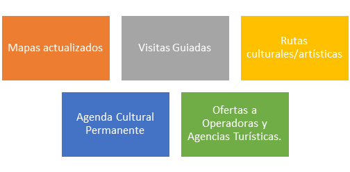 - Impulsar el desarrollo turístico local a través de la creación de rutas de interés cultural, patrimonial, artístico, artesanal y comunitario. Y la instalación de material impreso en el espacio público que reconozca su identidad.