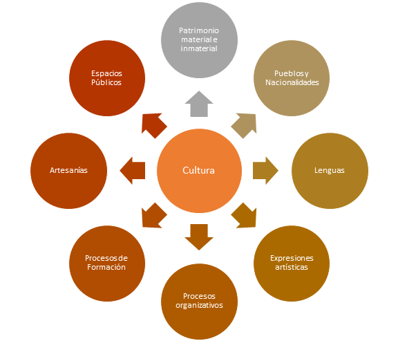 En el Ecuador, el trabajo cultural aporta alrededor del 3% del PIB nacional según el Sistema Integral de Información Cultural (SIIC). El artículo 21 de la Constitución de la República del Ecuador, la Ley de Cultura y su reglamento, y el Código Orgánico de Organización Territorial, Autonomía y Descentralización, en sus artículos 54 y 144, son claros en sus dimensiones y alcances para garantizar el Fomento, Promoción, y la democratización del acceso a los presupuestos de Cultura. En este sentido, los GADs asumen las competencias a nivel local de generar los espacios, planes, programas y proyectos adecuados para el desarrollo profesional de la cultura en pro de fortalecer la identidad local y acortar las brechas de discriminación y exclusión en el ejercicio de derechos que afectan a la población por razones culturales y étnicas. En este sentido, la cultura debe asumirse desde un campo expandido, de interés público, de derechos y que abarca la gestión local de: