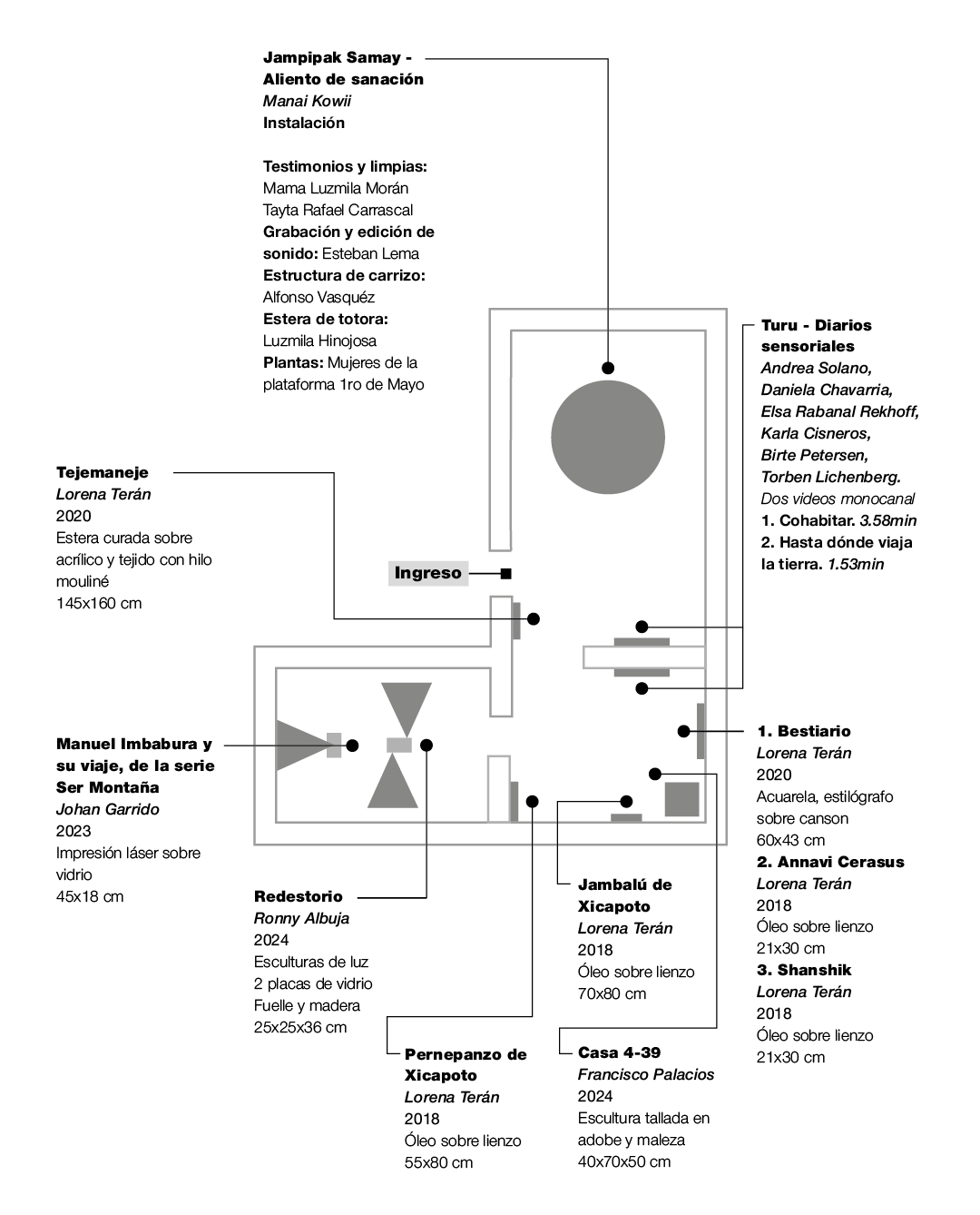 Francisco Palacios es artista visual, educador y Máster en Gestión y Desarrollo Social. Co-fundador de la plataforma cultural TOLA que trabaja alrededor de la herencia de los centros sagrados precolombinos de la cultura Karanki. Su trabajo explora técnicas de archivo, escultura, dibujo, pintura, serigrafía y fotografía. Para la exposición, instalarán esculturas de la serie Casa 4 – 39, obra que resignifica y transforma los materiales como el adobe, la cal, y las plantas conocidas como yerba mala que se apoderan de las construcciones abandonadas del casco urbano de la ciudad.